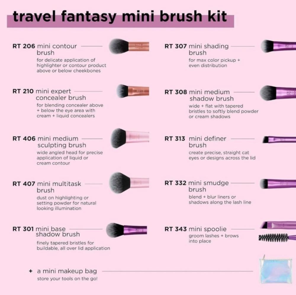 مجموعة فرش "Travel Fantasy Mini Brush Kit" من Real Techniques مثالية للسفر، حيث تتضمن 10 قطع بحجم صغير تناسب الشنط والمكياج أثناء التنقل.