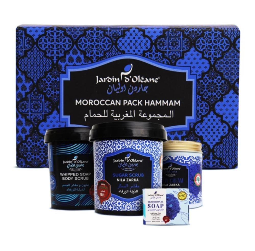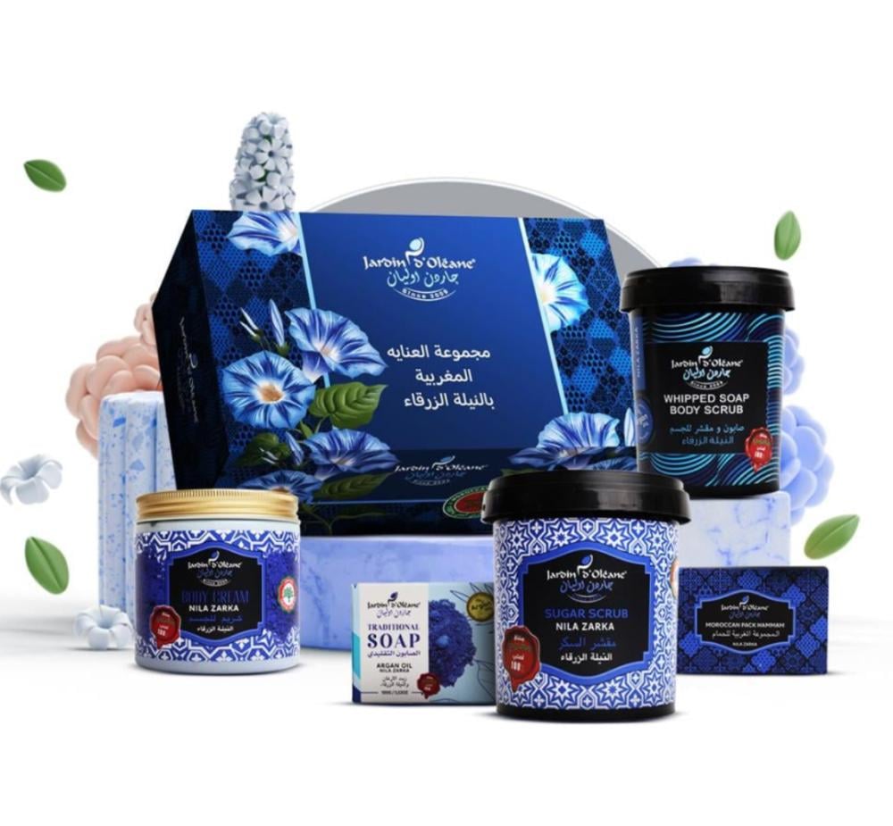 أضيفي لمسة من السحر المغربي إلى روتين العناية ببشرتك مع مجموعة العناية بالنيلة الزرقاء.
