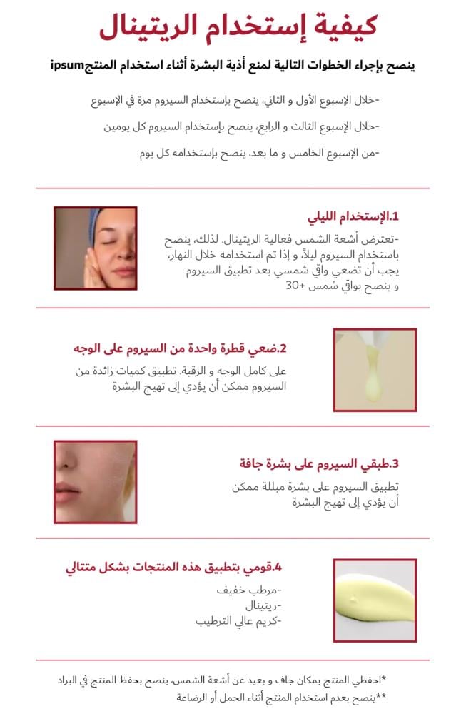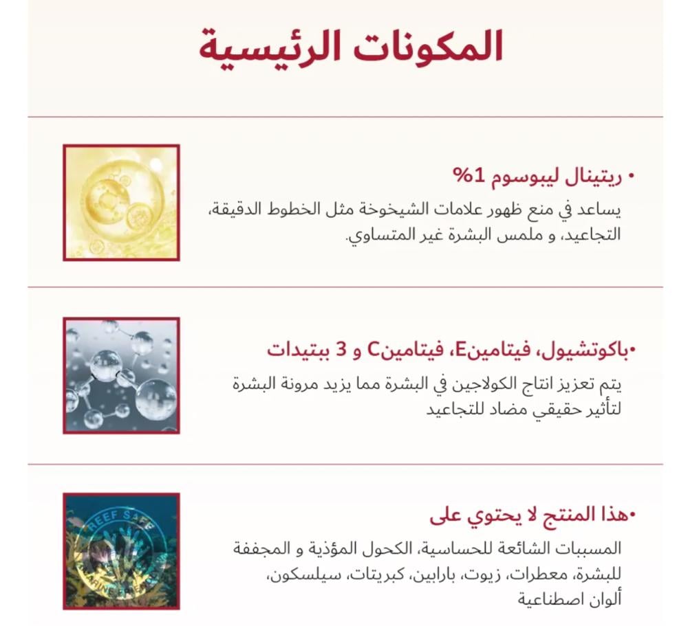 تركيبة فاخرة تحتوي على ريتينال ليبوسومي 1% الذي يعمل بعمق على تنعيم الخطوط، إلى جانب خلاصة الأرز المخمّر التي توحد لون البشرة وتمنحك إشراقة فورية!