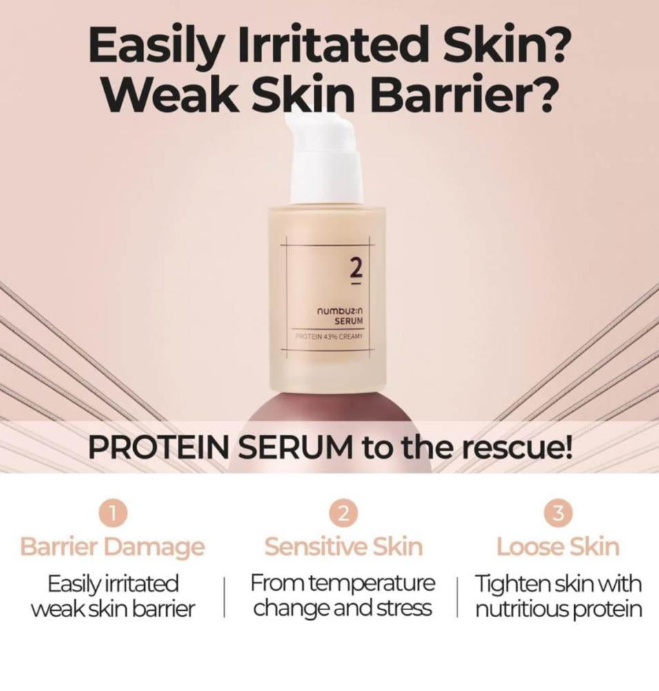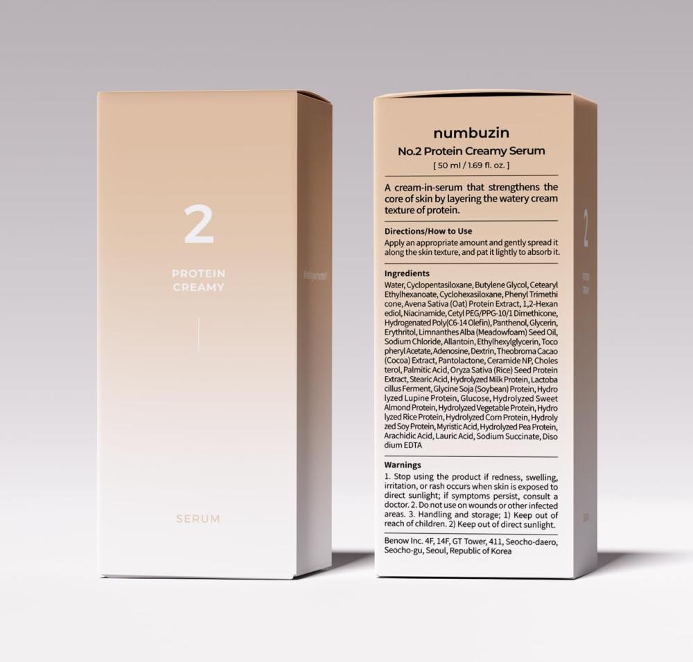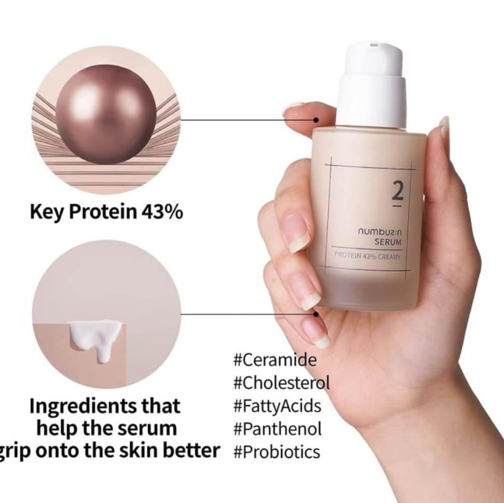 سيروم Numbuzin رقم 2 "كريمي البروتين 43%" مبتكر مصمم لتعزيز صحة البشرة وتقوية حاجزها الطبيعي. يحتوي هذا السيروم على نسبة 43% من البروتينات المستخلصة من مصادر طبيعية مثل الشوفان، الأرز، الحليب، الصويا، واللوز الحلو، مما يوفر تغذية عميقة للبشرة ويساعد في تعزيز مرونتها.
